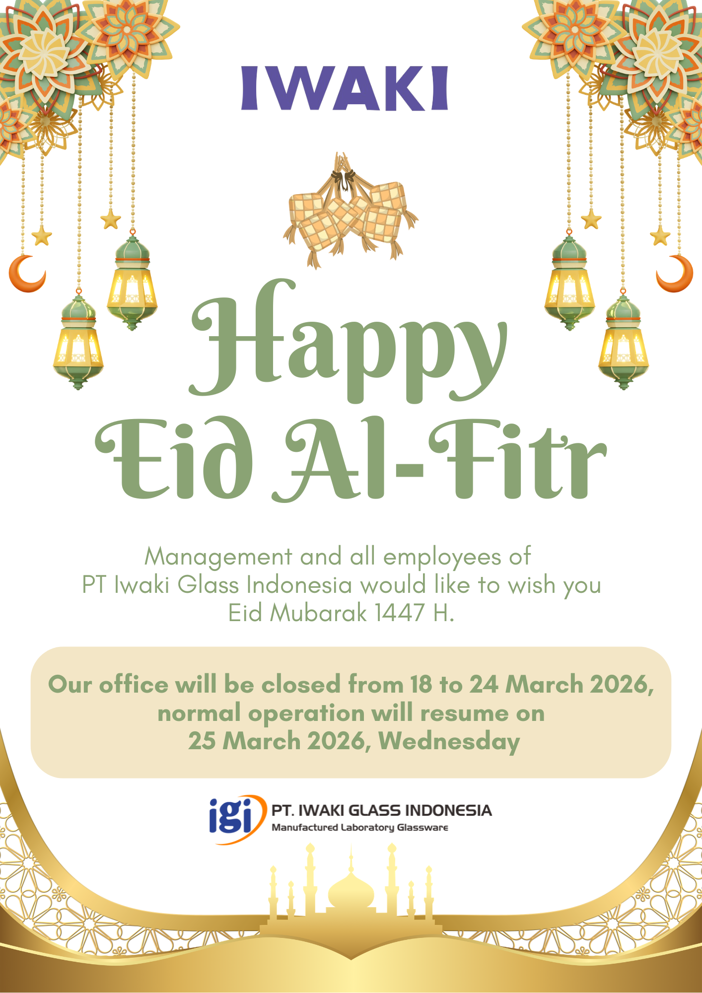 The Management and Employees of PT Iwaki Glass Indonesia wish you a blessed Eid Mubarak 1447 H.